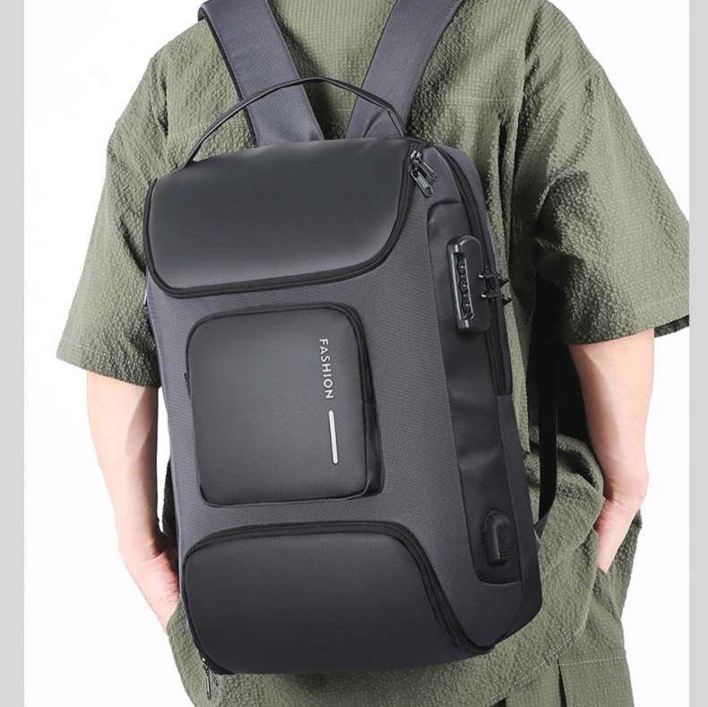 スタイリッシュ通学用防水リュック グレーの都会的デザイン
