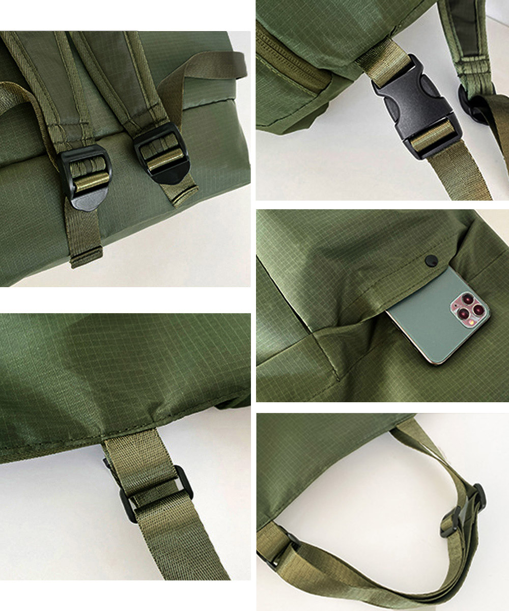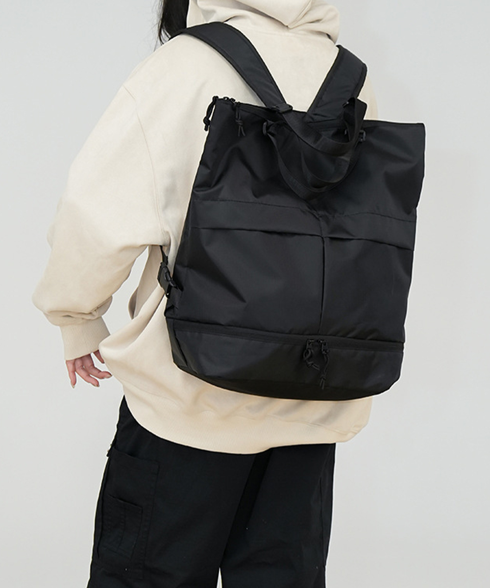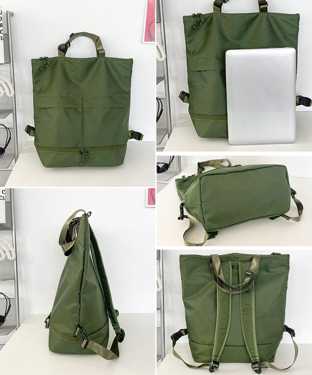 防水機能付きナイロン製リュックサック。リュック、肩掛け、手提げの三通りで使える多機能バッグです。
