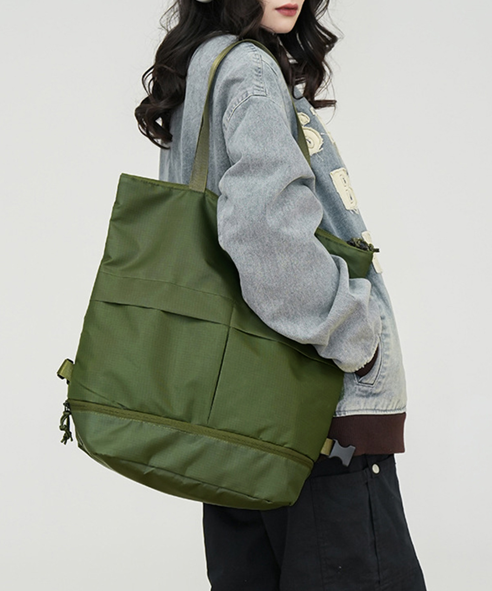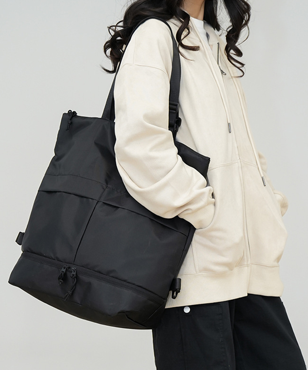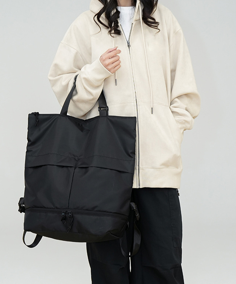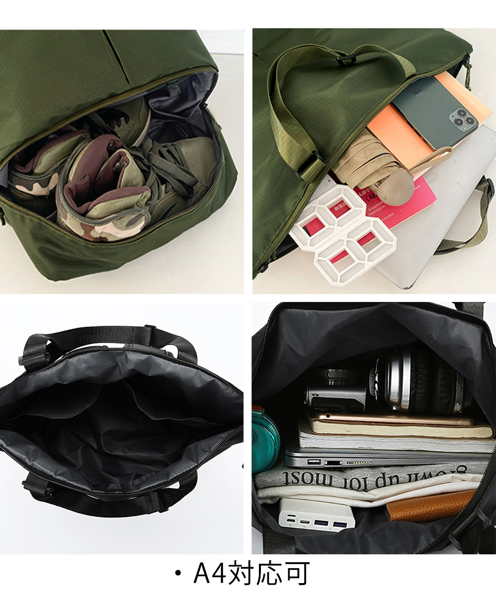 底部には靴や着替えを分けて収納できるセパレート式ポケット付き。四十三センチの大容量サイズでA4書類もすっぽり収納可能。