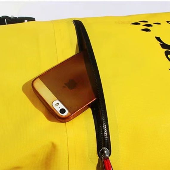 ロールトップ式の開口部で密閉性が高く、フロントには便利なファスナーポケット付き。